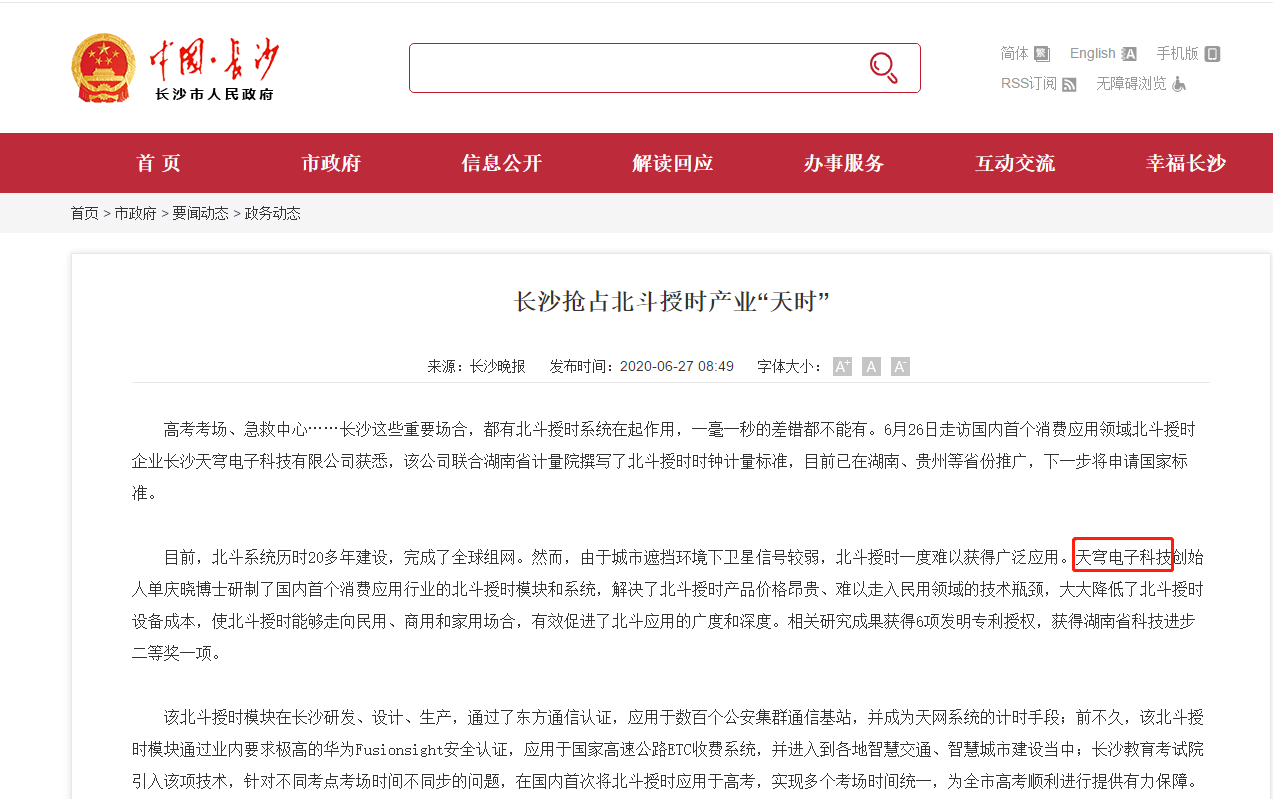 近日,随着北斗三代卫星导航系统的正式开通,国内形成一个北斗热。长沙具有较好的北斗产业规划,天穹电子作为北斗授时的标杆企业,获得了多家媒体的关注,被各家媒体争相报道。